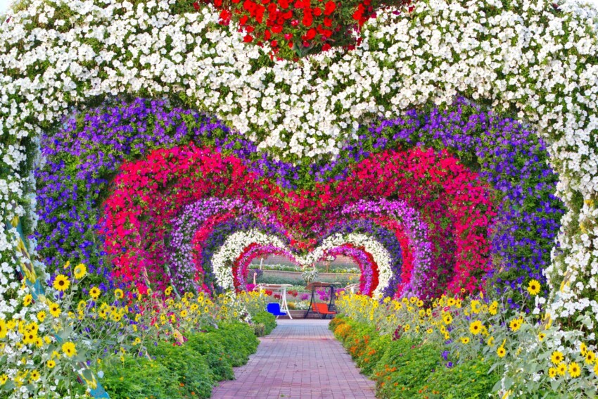 El Dubai Miracle Garden es un impresionante jardín ubicado en Dubailand, conocido por ser el más grande del mundo con flores naturales. Desde su apertura en 2013, atrae a miles de visitantes por sus 72 mil metros cuadrados decorados con 45 millones de flores que forman figuras como corazones, estrellas y pirámides, cambiando sus motivos según la temporada.